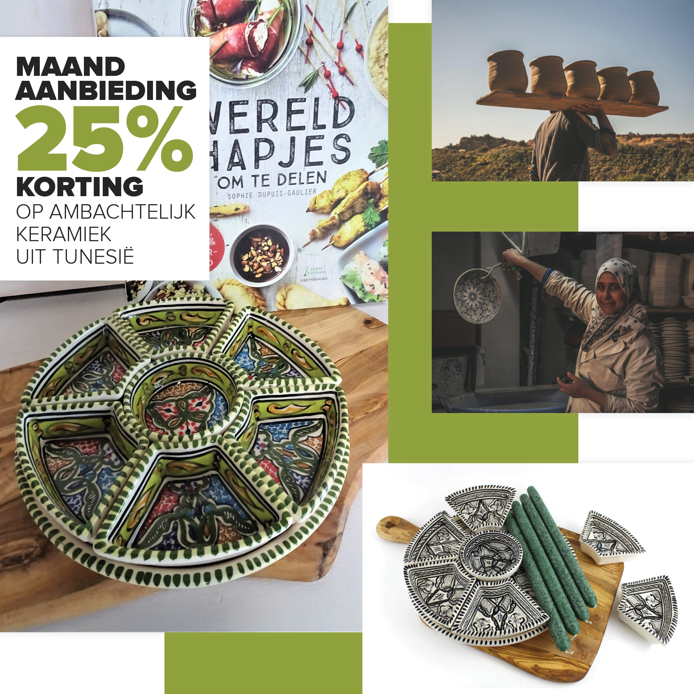 In de maand november 2020 wil Wereldwinkel Noordwijkerhout graag het verhaal vertellen van de pottenbakkers in Tunesië. In dit verhaal spelen vrouwen een grote rol. Zij zorgen voor de kleurrijke decoraties van bijvoorbeeld de tapasschalen. Deze schalen worden deze maand aangeboden met een korting van 25%.