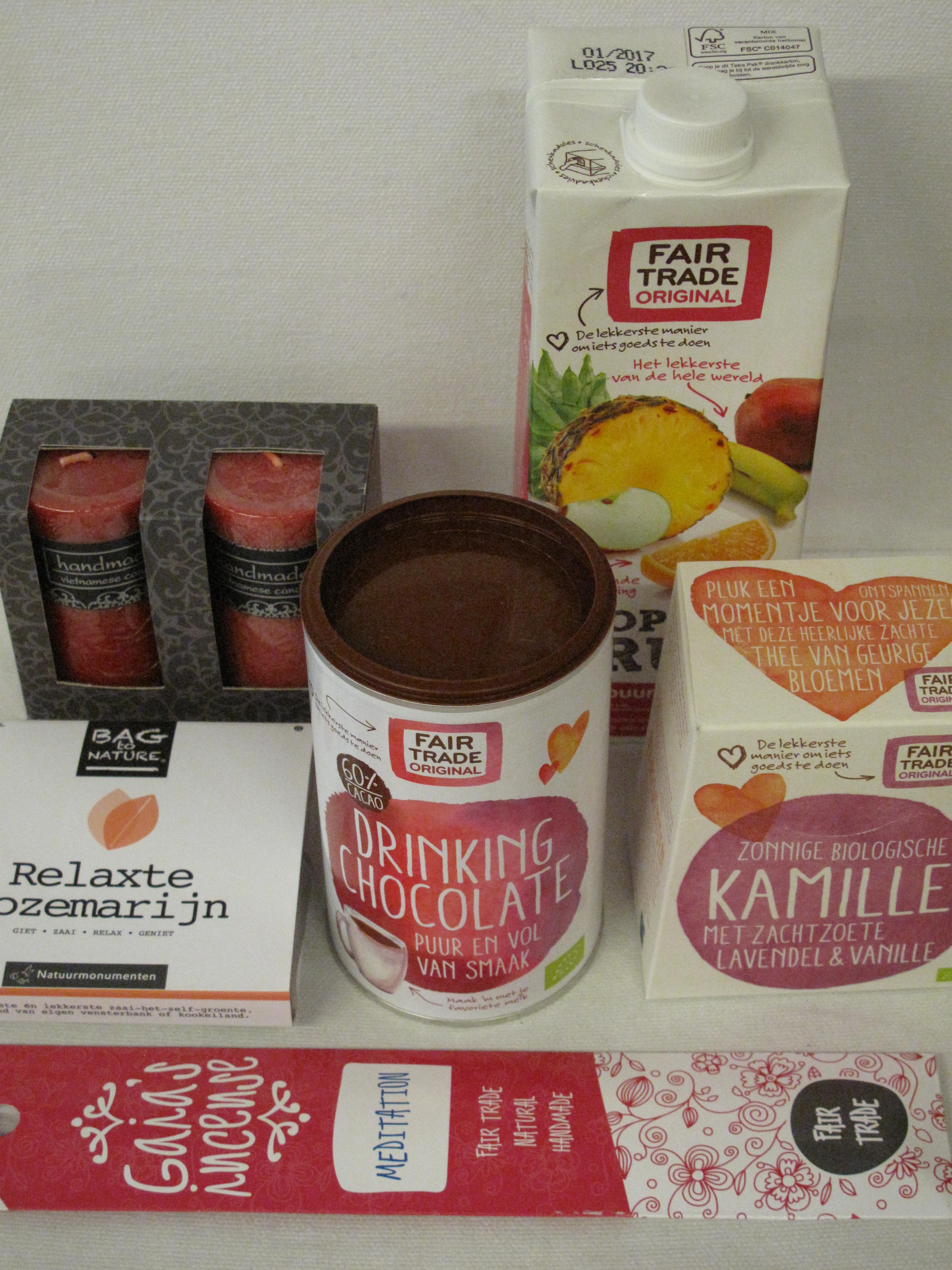 Fairtrade thee, chocolate drink, vruchtensap, kaarsen, wierook plus een Bag to Nature kruidentuintje in cadeauverpakking.