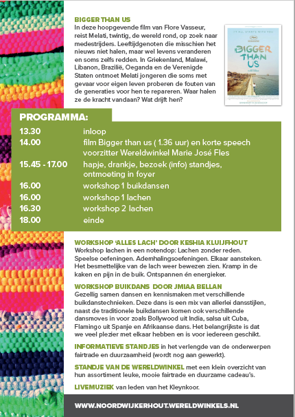 Om 14.00 uur start de indrukwekkende film Bigger than us, over jongeren die soms met gevaar voor eigen leven proberen de fouten van de generaties voor hen te repareren. Na de film is er gelegenheid om twee workshops te volgen: workshop lachen door Keshia Kluijfhout, en workshop buikdansen door Jmiaa Bellan. In de foyer staan hapjes en drankjes voor u klaar en kunt u een kijkje nemen bij diverse stands:
