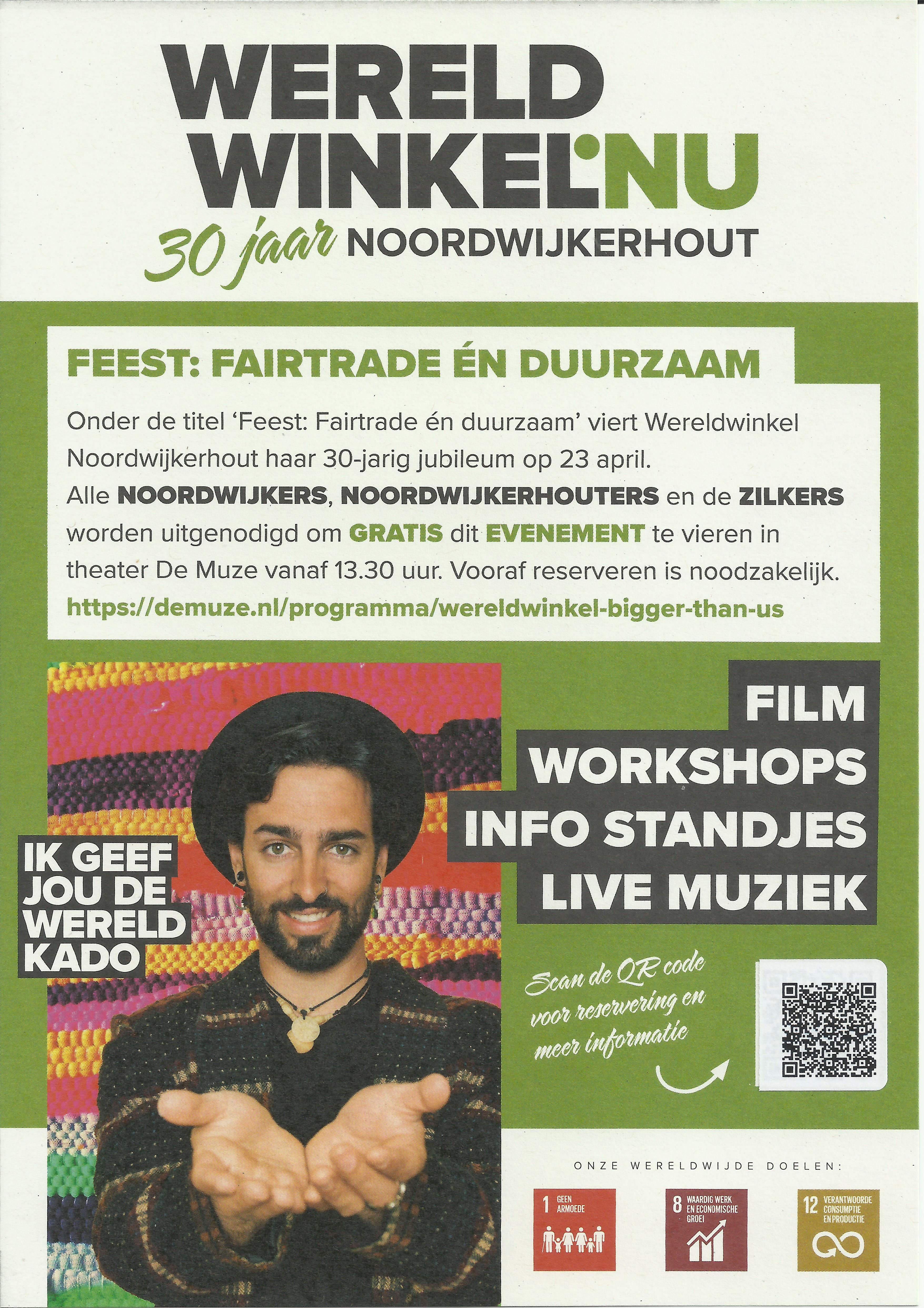 Onder de titel ‘Feest: Fairtrade én duurzaam’ viert Wereldwinkel Noordwijkerhout haar 30-jarig jubileum op 23 april. Alle Noordwijkers, Noordwijkerhouters en de Zilkers worden uitgenodigd om gratis dit evenement te vieren in theater de Muze. Vooraf reserveren is noodzakelijk, zie hiervoor de website https://demuze.nl/programma/wereldwinkel-bigger-than-us. Er is een gevarieerd programma samengesteld bestaande uit film, muziek, workshops en informatieve stands. Maar bovenal is er veel ruimte voor ontmoeting en samenzijn onder het genot van een hapje en een drankje. Wij hopen veel vrienden, donateurs en klanten te mogen verwelkomen. Vanaf 13.30 uur bent u van harte welkom.