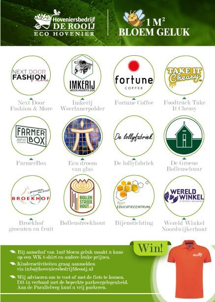 Op zaterdag 2 juli is het feest bij hoveniersbedrijf De Rooij in Hillegom. Het bedrijf bestaat 20 jaar en dat wordt uitgebreid gevierd. Het bedrijf, dat zich heeft gespecialiseerd in duurzaam en biologisch tuinonderhoud en aanleg, organiseert een Groene inspiratie markt met tal van activiteiten. Ook de Wereldwinkel is aanwezig met een stand vol bijzondere fairtrade producten. Kom gezellig langs tussen 10.00 en 16.00 uur.