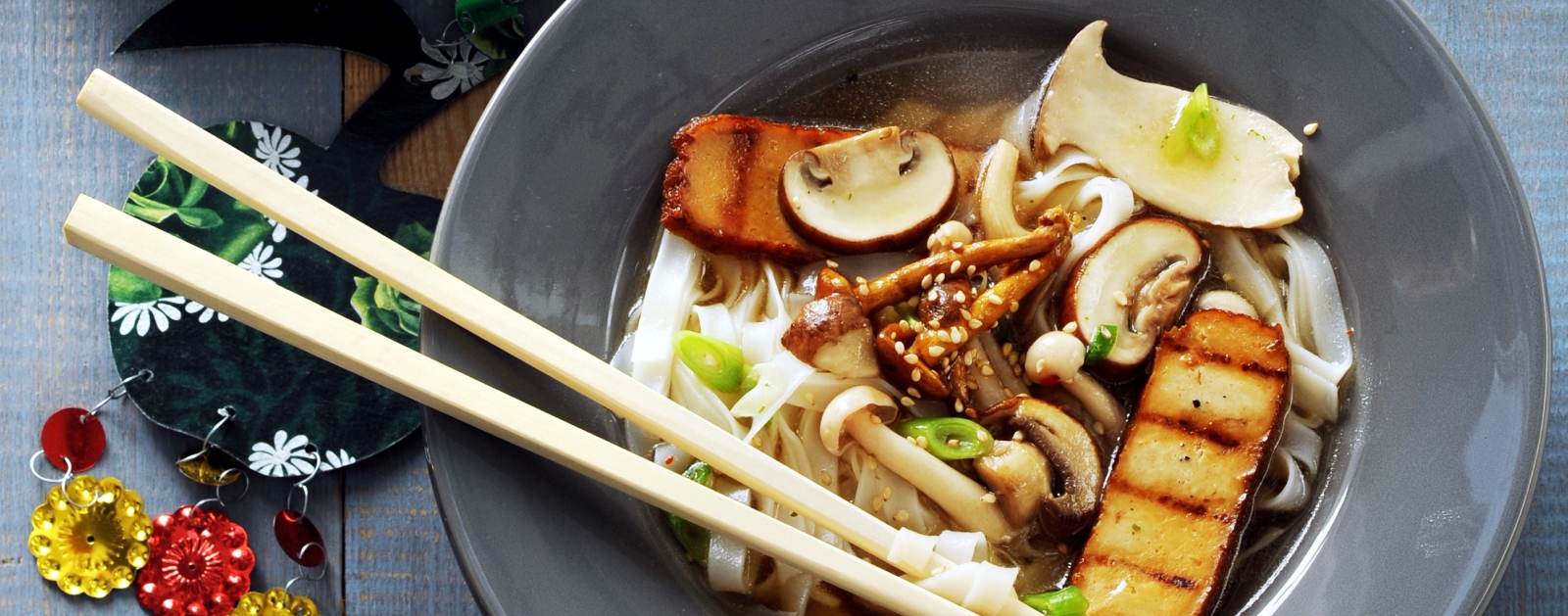 Het recept voor deze Oosterse paddenstoelen bouillon met rijstnoedels vindt u in de Wereldwinkel.