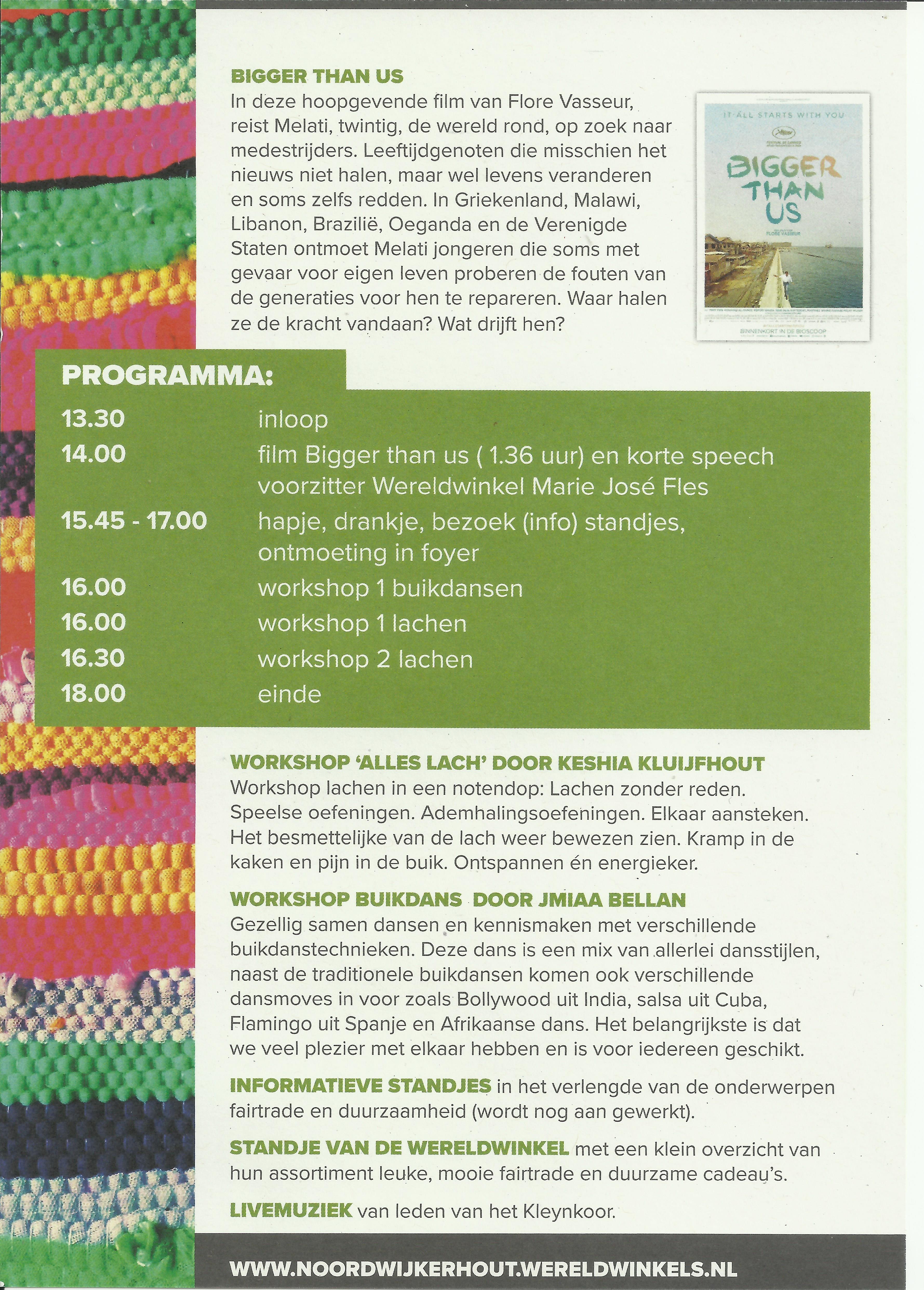 Onder de titel ‘Feest: Fairtrade én duurzaam’ viert Wereldwinkel Noordwijkerhout haar 30-jarig jubileum op 23 april. Alle Noordwijkers, Noordwijkerhouters en de Zilkers worden uitgenodigd om gratis dit evenement te vieren in theater de Muze vanaf 13.30 uur. Vooraf reserveren is noodzakelijk, zie hiervoor de website https://demuze.nl/programma/wereldwinkel-bigger-than-us. Er is een gevarieerd programma samengesteld bestaande uit film, muziek, workshops en informatieve stands. Maar bovenal is er veel ruimte voor ontmoeting en samenzijn onder het genot van een hapje en een drankje.