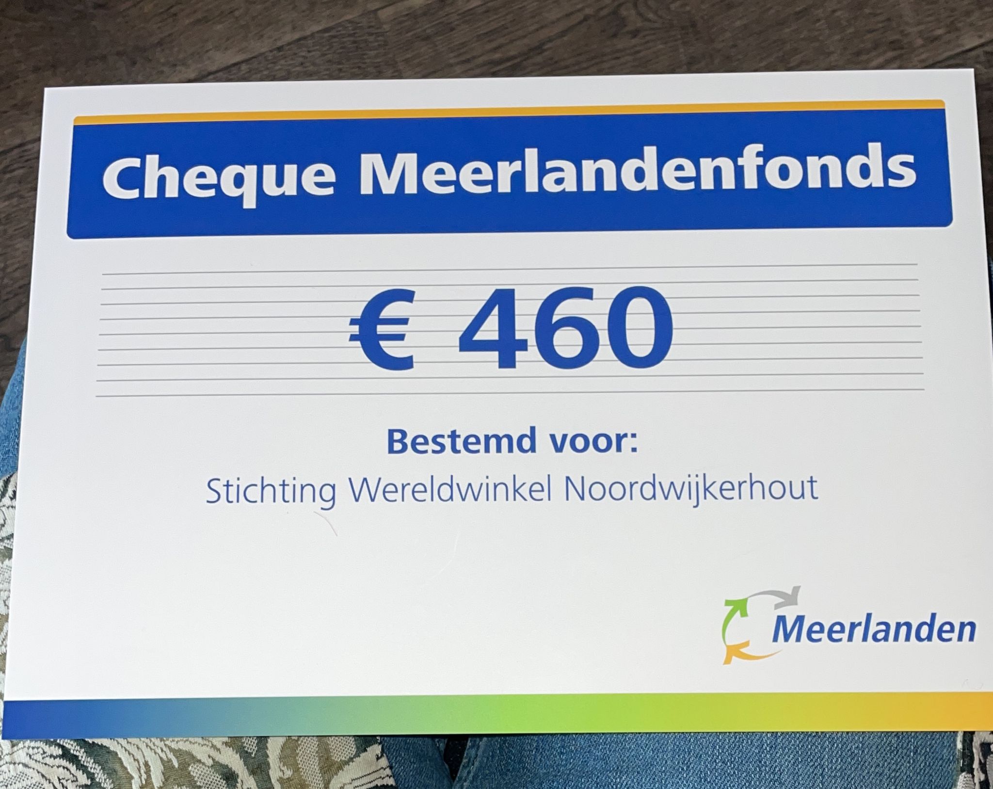 Tijdens een feestelijke bijeenkomst op 13 februari 2025 bij Nederzand aan de Langevelderslag te Noordwijk, maakte het Meerlandenfonds bekend welke goede doelen een mooie donatie mochten ontvangen. Namens Wereldwinkel Noordwijkerhout nam voorzitter Marie-José Fles de cheque van € 460,- in ontvangst. Dit bedrag zal de Wereldwinkel besteden aan het vernieuwen van het computersysteem in de winkel aan de Dorpsstraat 44.