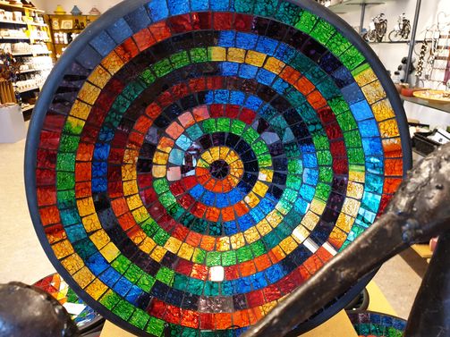 Wereldwinkel Noordwijkerhout verkoopt schalen, vazen en onderzetters gemaakt van aardewerk met glasmozaïek. Het zijn echte blikvangers, verkrijgbaar in steeds wisselende kleuren en patronen.