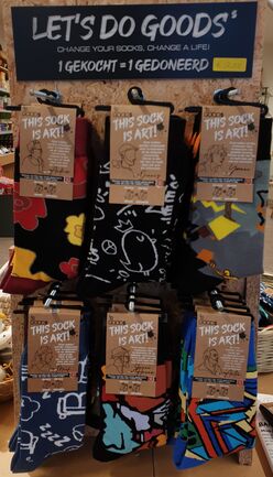 “We ontwerpen onze sokken met kunstenaars. Deze kunstenaars zijn speciaal. Ze hebben allemaal geleefde ervaring op het gebied van dakloosheid, verslaving en psychiatrie. Hun verhalen vind je terug op onze sokken, sokken met echte verhalen dus. We verkopen zoveel sokken dat we nu samen met het Leger des Heils een plek hebben opgezet waar we (ex-) dakloze mensen de mogelijkheid geven op werk en herstel. Hier worden sokken gemaakt die worden gedoneerd. Want voor elk paar sokken dat wordt verkocht, wordt een paar gedoneerd aan dakloze mensen.”